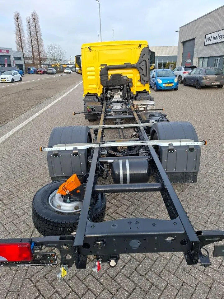 Korte gele cabine (RAL 1023) met 3 zitplaatsen, wielbasis van 4200 mm, 250 pk motor en automatische versnellingsbak. Toegelaten maximumgewicht van 12 ton, ingebouwde airco, achterruit, PTO, LED-koplampen en -achterlichten, evenals een zonneklep.